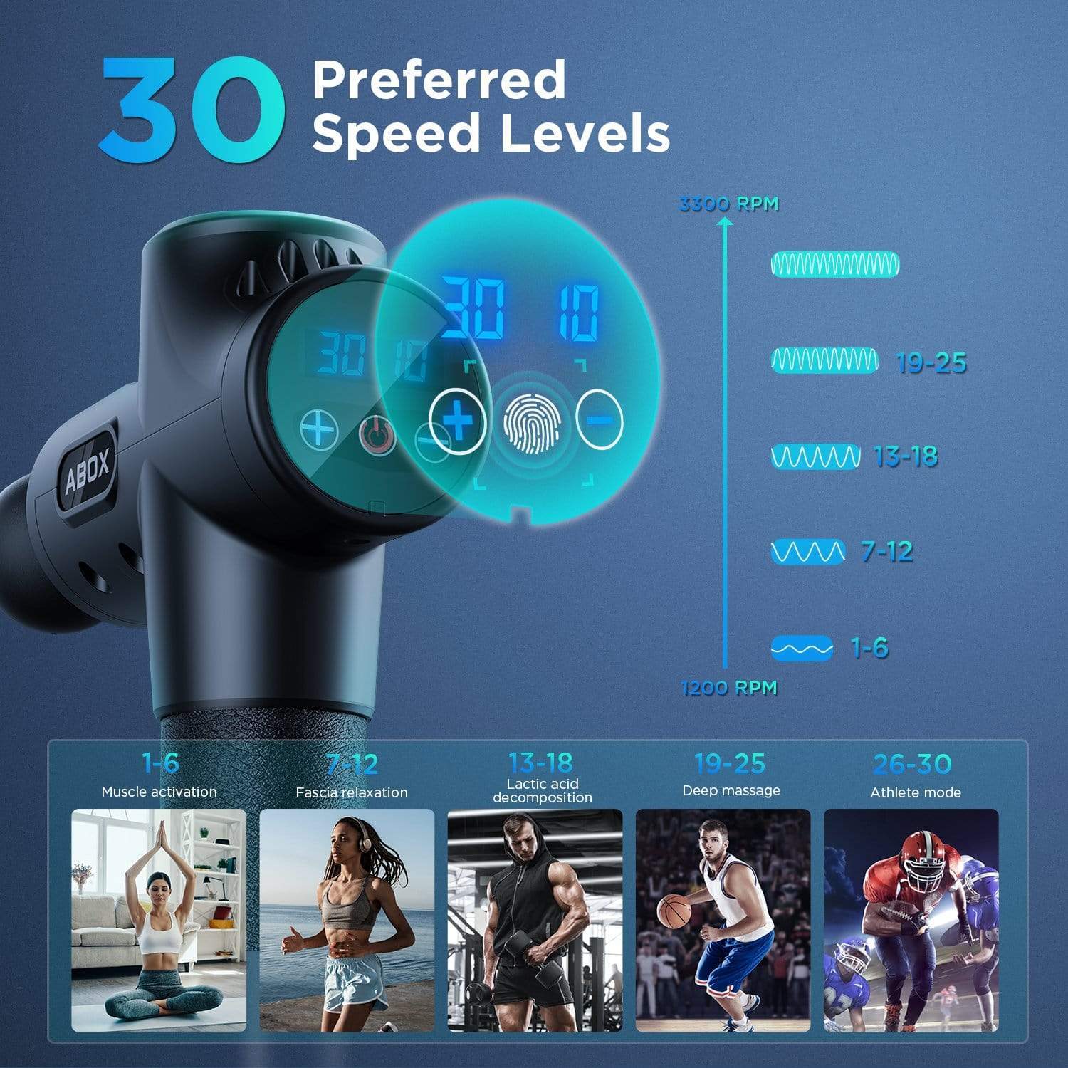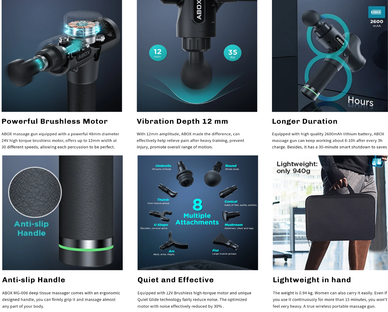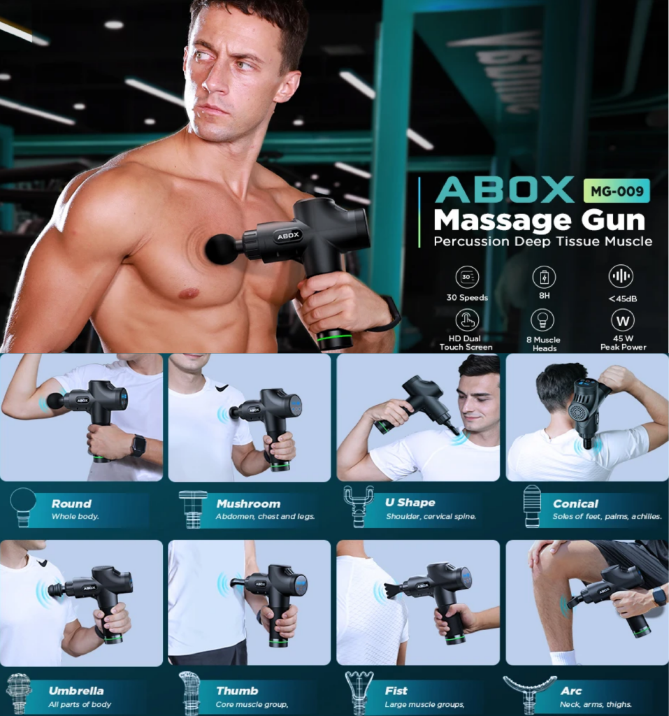 🔈【QUIET & DURABLE】ABOX athlete massager has unique quite glide techonology, ultra-strong heat dissipation function, reduces noise to 35-50dB only. The high-precision mould and chipset ensures long working time, preventing the machine overheated