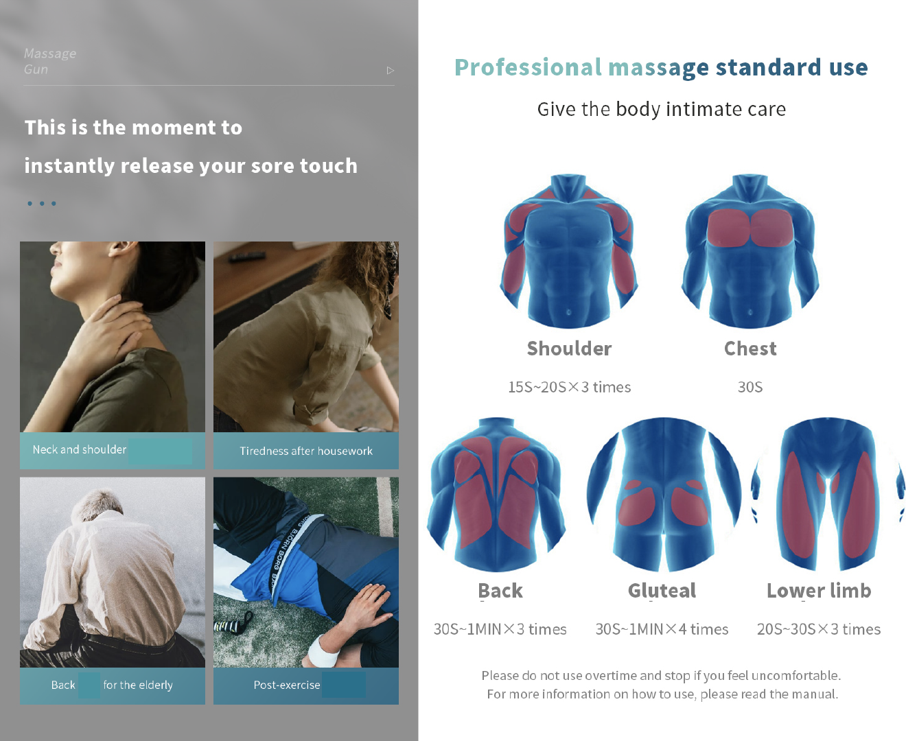 🧘 【Deep Relaxation】 This Massage Gun relieves any level of body soreness through deep and powerful massage after exercise. Handheld massage gun can be used for athletes to help restore the body faster. It can also be used to prepare the body during warm-up before exercise, or just for a gentle, relaxing message of the body.