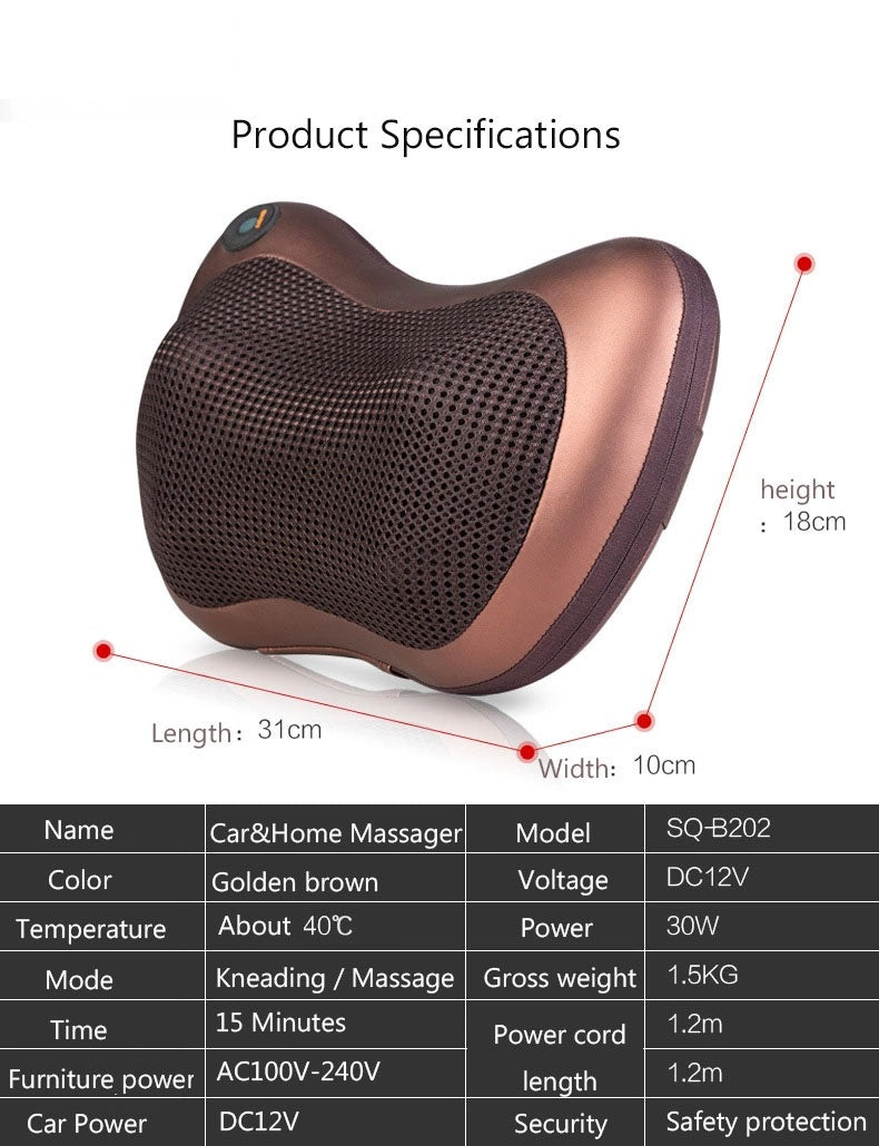 ⭐Specifications Color: Copper Bronze Cover material: PU leather + polyester mesh Product size: 12" x 8" x 3.5"(L x W x H) Package includes: 1 x Massage pillow 1 x Car plug 1 x US plug 1 x Instruction